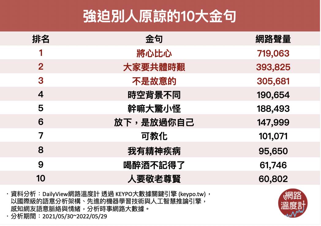 隨著年齡逐漸增長,你一定或多或少都曾發生被別人「強迫原諒」的情況,不論是「人非聖賢無能無過」、「我是為你好」的套路模式都讓人備感壓力,今天《DailyView網路溫度計》就透過《KEYPO大數據關鍵引擎》,帶你一窺究竟「強迫別人原諒的10大金句」,一起來看看你遇過哪些狀況吧!