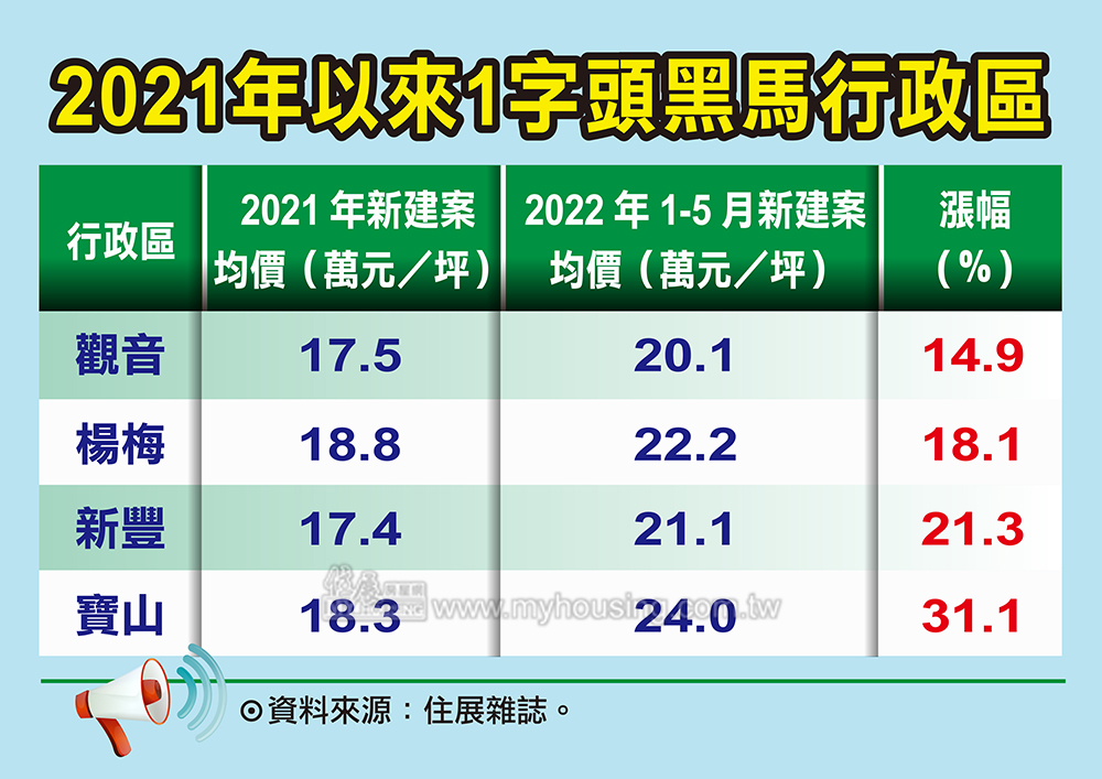 進一步觀察四個在今年告別1字頭房價區,即桃園觀音、楊梅、新竹縣新豐及寶山等四個區域,今年前五個月新建案房價漲幅都高達二位數;其中,觀音漲約15%、楊梅漲約18%、新豐漲約21%,而寶山漲幅竟高達驚人的31%。
