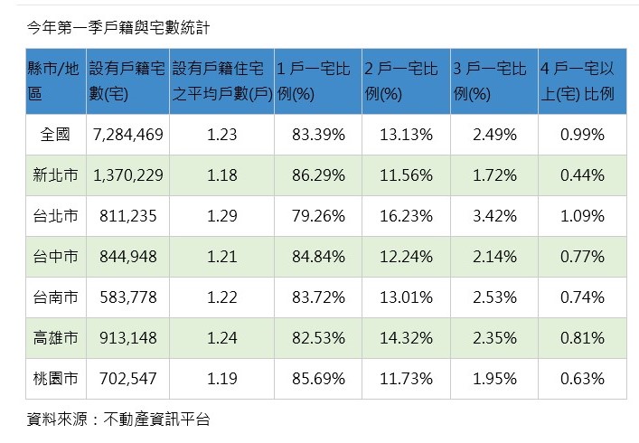 今年第一季統計資料顯示,全國設有戶籍住宅平均戶數為1.23戶,其中北市數量最高,平均每宅有1.29戶,其中北市有79.3%屬於一戶一宅,比例是六都最低,2戶一宅比例則為16.23%,六都最高,3戶一宅比例為3.42%,同樣也是六都最高,四戶一宅與五戶一宅比例都是北市居冠,反映北市多戶一宅現象相對其他區域更為普遍。