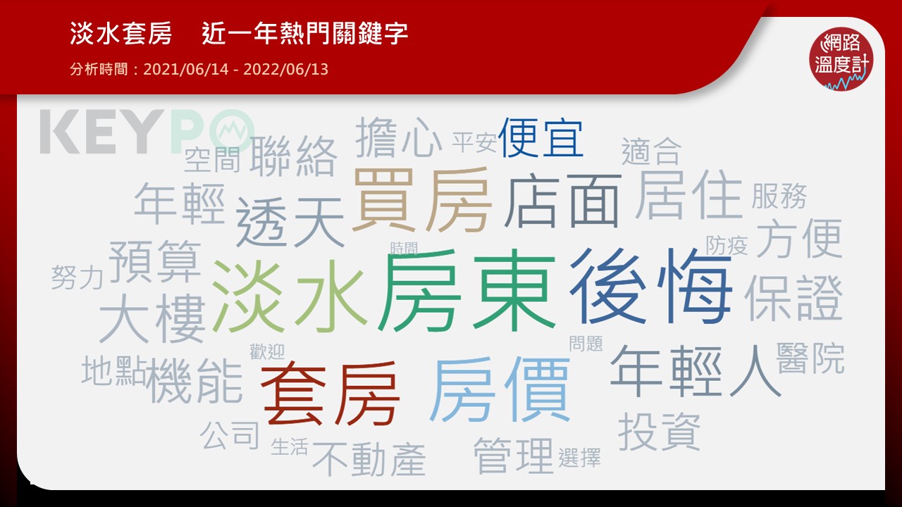 進一步透過《KEYPO大數據關鍵引擎》輿情分析系統來看近一年(2021/06/14 - 2022/06/13)「淡水套房」熱門關鍵字,其中「後悔」一詞就上榜,討論關於退休後是否要去淡水買套房養老,令眾人紛紛勸退。