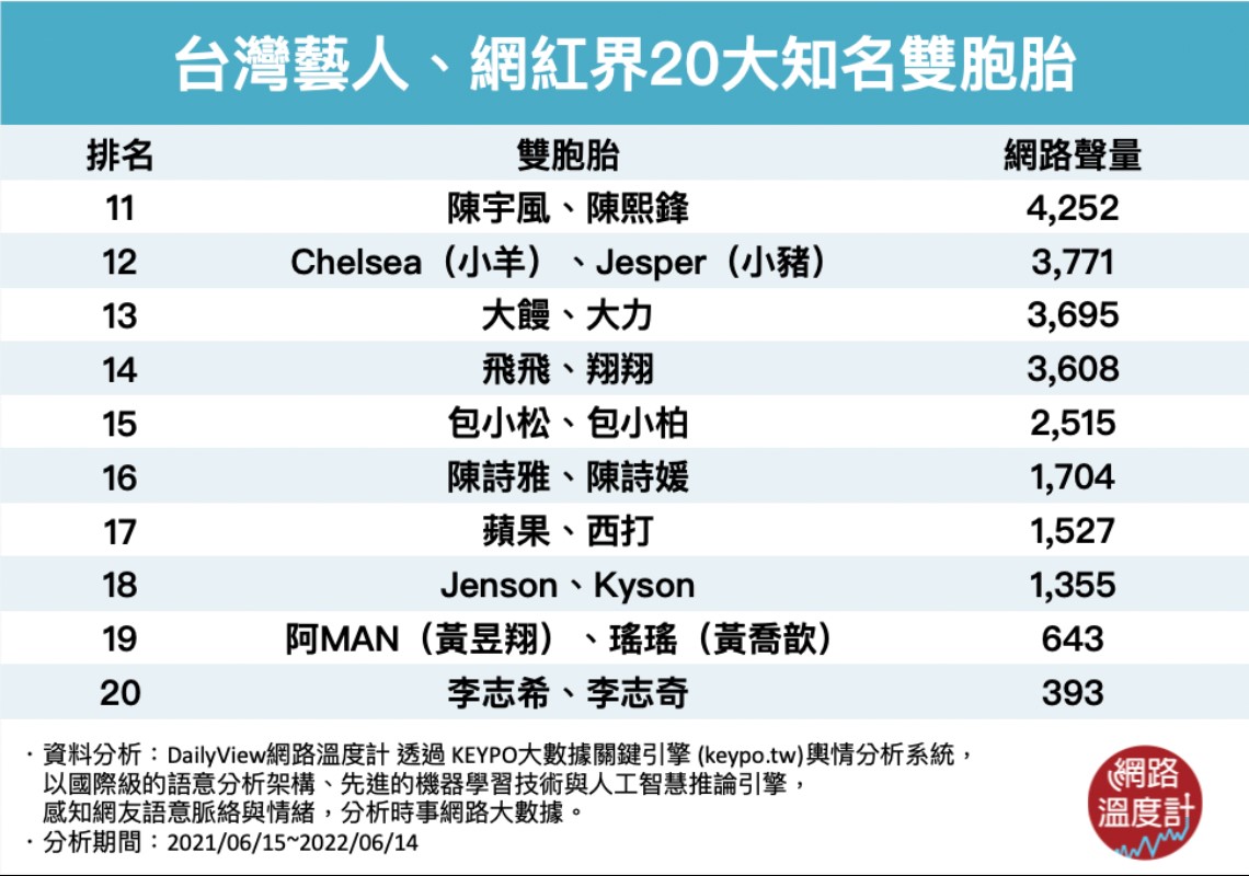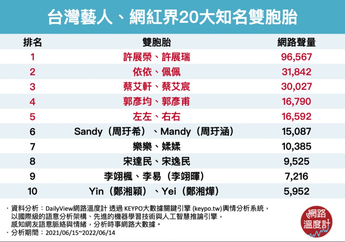 你知道演藝圈其實存在許多雙胞胎藝人和網紅嗎?今天就讓《DailyView網路溫度計》透過《KEYPO大數據關鍵引擎》輿情分析系統,一起來看看你能不能分辨20大台灣演藝圈、網紅界知名雙胞胎吧!