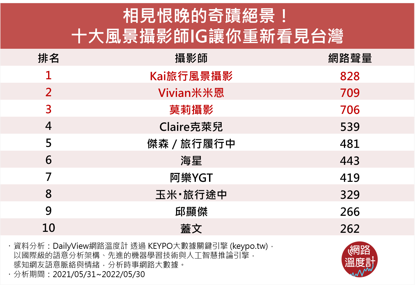在IG上,就有這樣一群致力拍出台灣之美的攝影師,看見他們的照片,你一定也會忍不住驚嘆:「這真的是我所知道的台灣嗎?」今天,就和《DailyView網路溫度計》一起,透過《KEYPO大數據關鍵引擎》,欣賞深受網友喜愛的IG十大台灣風景攝影師作品吧!