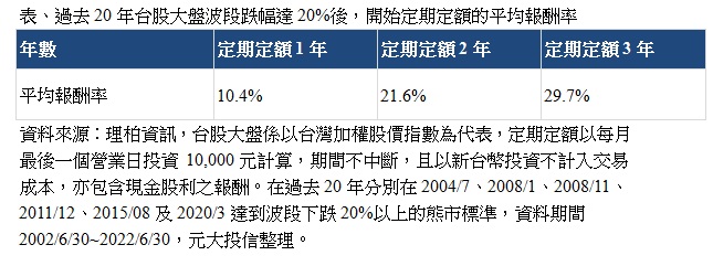 回顧台股大盤歷史表現,若出現波段大跌20%的「熊市」情境,短線盤勢仍可能波動,但隨基本面觸底回升,中長線行情都能重返漲升軌道。統計過去20年資料,假設在台股達到「熊市」後,於每月底進行定期定額操作,投資1年的平均報酬率為10.4%,2年為21.6%,3年更可以達到29.7%(理柏資訊,資料時間2002/6/30-2022/6/30)