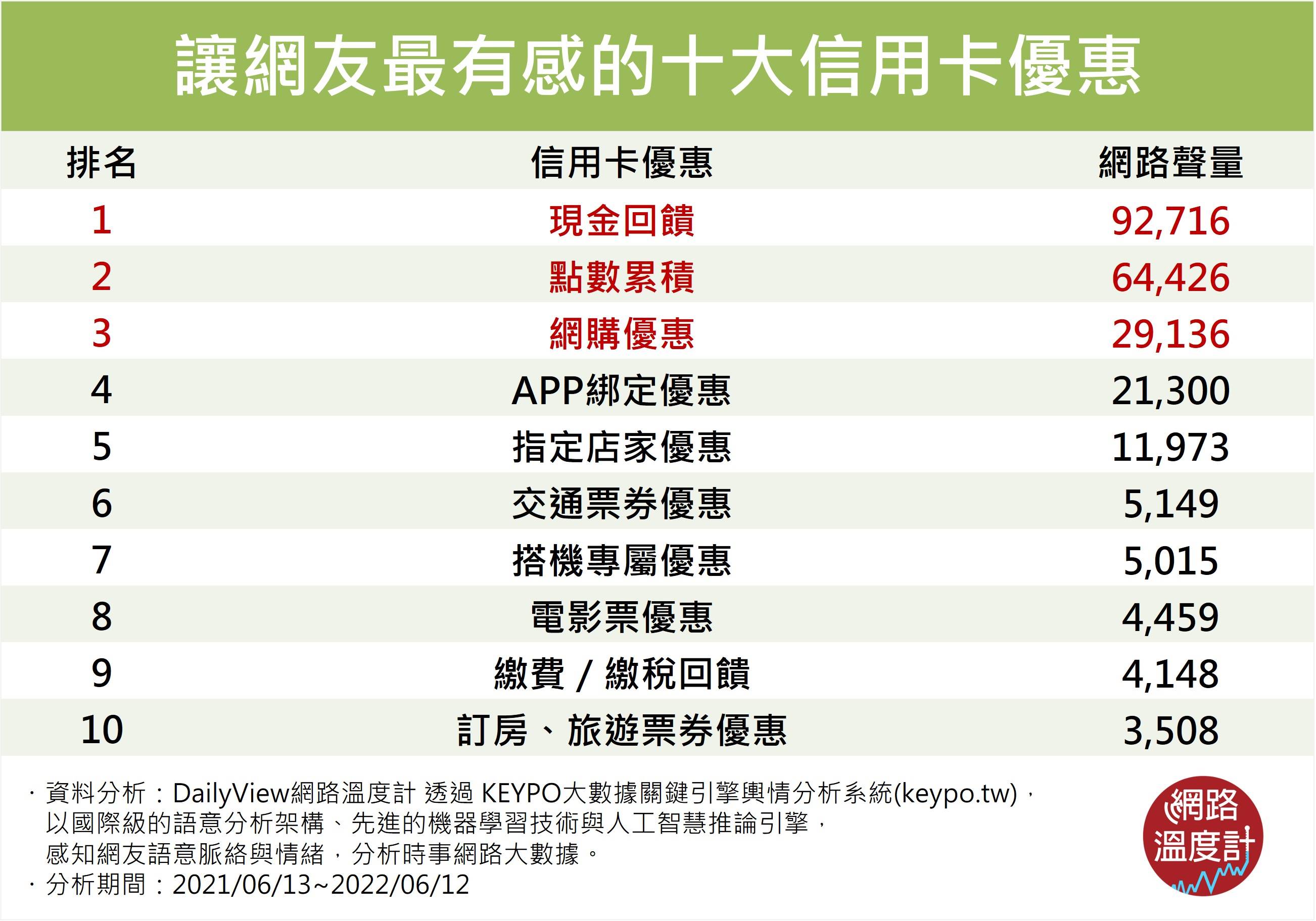 今天《DailyView網路溫度計》就透過《KEYPO大數據關鍵引擎》輿情分析系統,盤點了網友最有感的十大信用卡優惠,快來看看你手中的卡片有沒有這項功能吧!