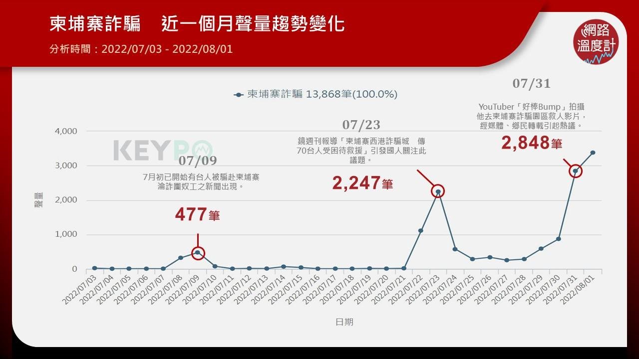 透過透過《KEYPO大數據關鍵引擎》輿情分析系統觀察「柬埔寨詐騙」(時間:2022/07/03 - 2022/08/01 )近一個月網路聲量,共有13,868筆,高峰主要集中在七月底,是因為7月23日《鏡週刊》開始系列報導柬埔寨詐騙新聞,引發國人關注,接著位於《DailyView網路溫度計》YouTuber排名第71名「好棒Bump」拍攝他去柬埔寨詐騙園區救人影片,經媒體與網友們的轉載後,此議題討論度聲量再度飆升。