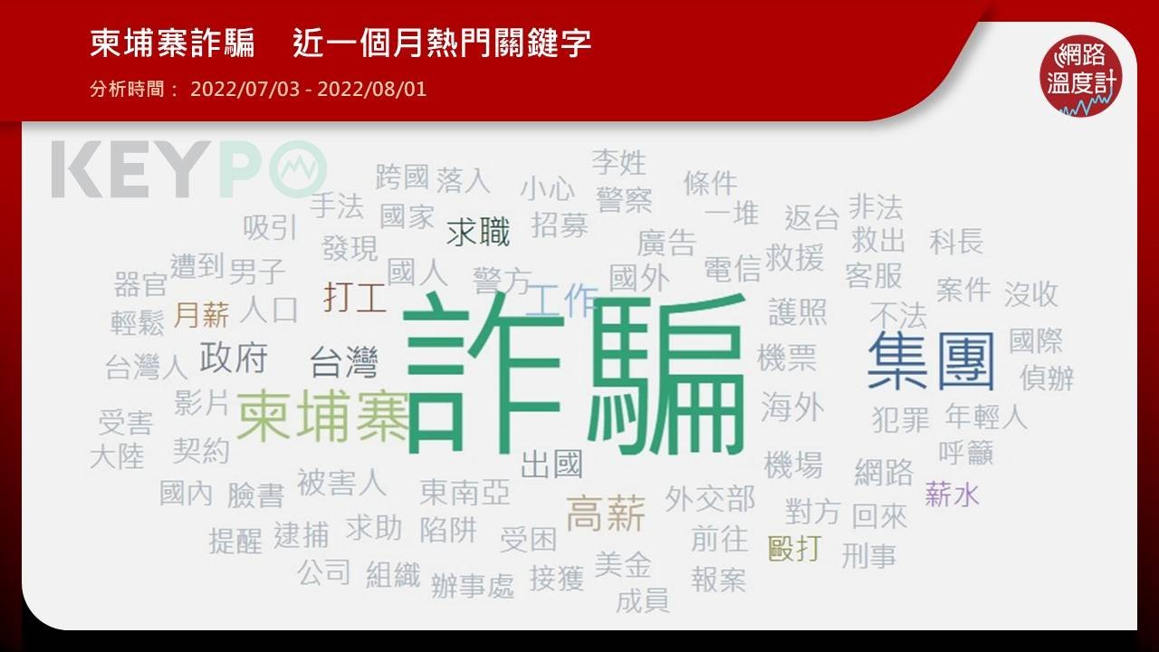 進一步再從《KEYPO大數據關鍵引擎》輿情分析系統查看「柬埔寨詐騙」(時間:2022/07/03 - 2022/08/01 )近一個月熱門關鍵字,其中「詐騙」、「求職」、「打工」、「高薪」等一詞皆上榜,《DailyView網路溫度計》也報導過「柬埔寨公司超狂徵才文案」一文,對此,104人力銀行針對柬埔寨工作詐騙案,已採3大措施來避免求職者上當。