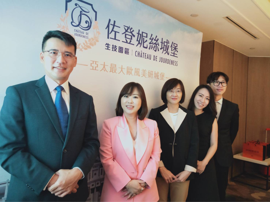 第一張圖說:佐登妮絲集團總經理陳佳琦(左2)率經營團體與媒體相見,左1為佐登妮絲城堡總經理陳春安,右3為集團財務長程小慧。