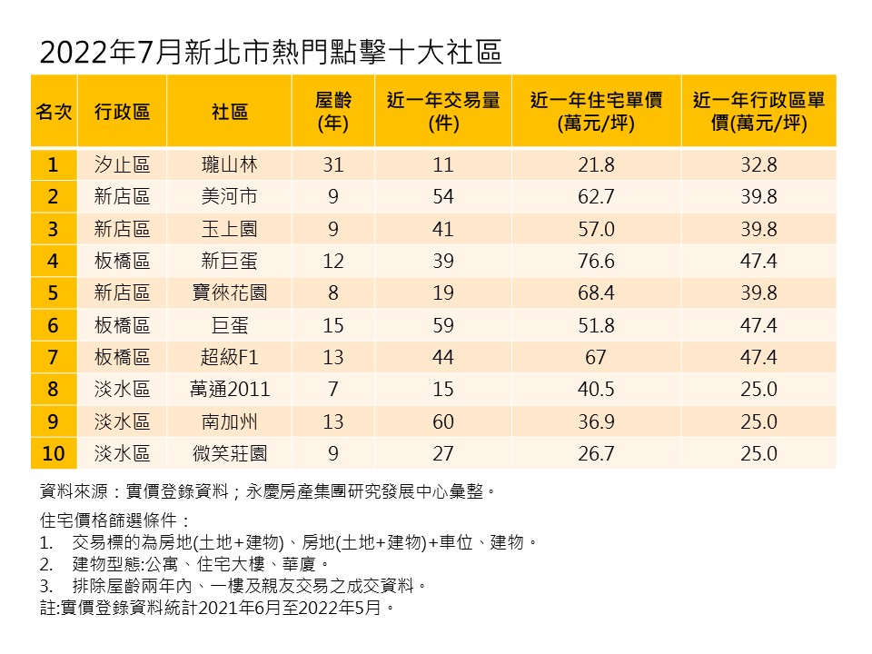 【理財周刊記者顏瓊真報導】永慶房屋根據永慶房仲網網路物件點閱資料,統計出2022年7月新北市的熱門社區;其中前十大都是雙北地區的熱門常勝軍,汐止「瓏山林」位居首位,新店、板橋各有三所社區入榜。值得注意的是,過往較不常見的淡水地區,如今也有三個社區上榜。