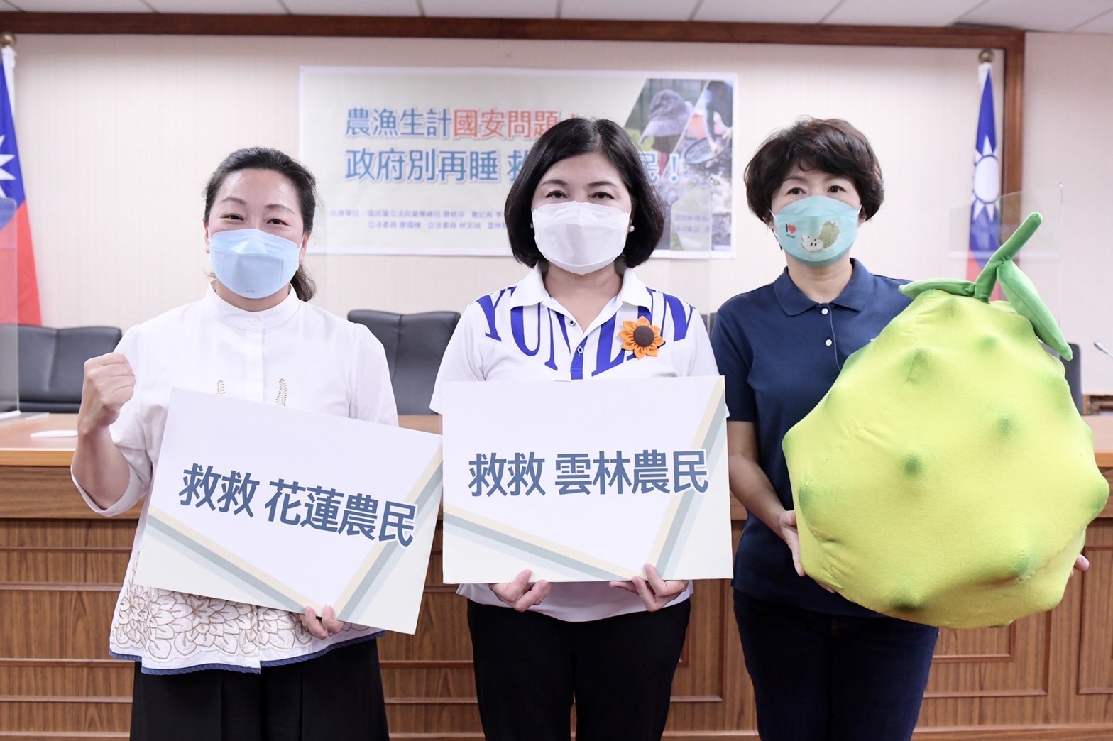 「救救農漁民!」中國大陸自去年開始陸續宣布暫停進口台灣鳳梨、釋迦、蓮霧、石斑魚等產品,近日更因美國眾議院議長裴洛西(Nancy Pelosi)訪台,中國再次宣布於8月3日起暫停台灣柑橘類(含文旦)、冰鮮白帶魚、冷凍竹筴魚等進口。立委傅崐萁於26日早更召集縣市首長於立法院紅樓召開記者會為農漁民發聲,縣長徐榛蔚北上力挺,呼籲國家切莫忽視農漁民生計,提出具體解決方案,讓國人能安穩生活!
