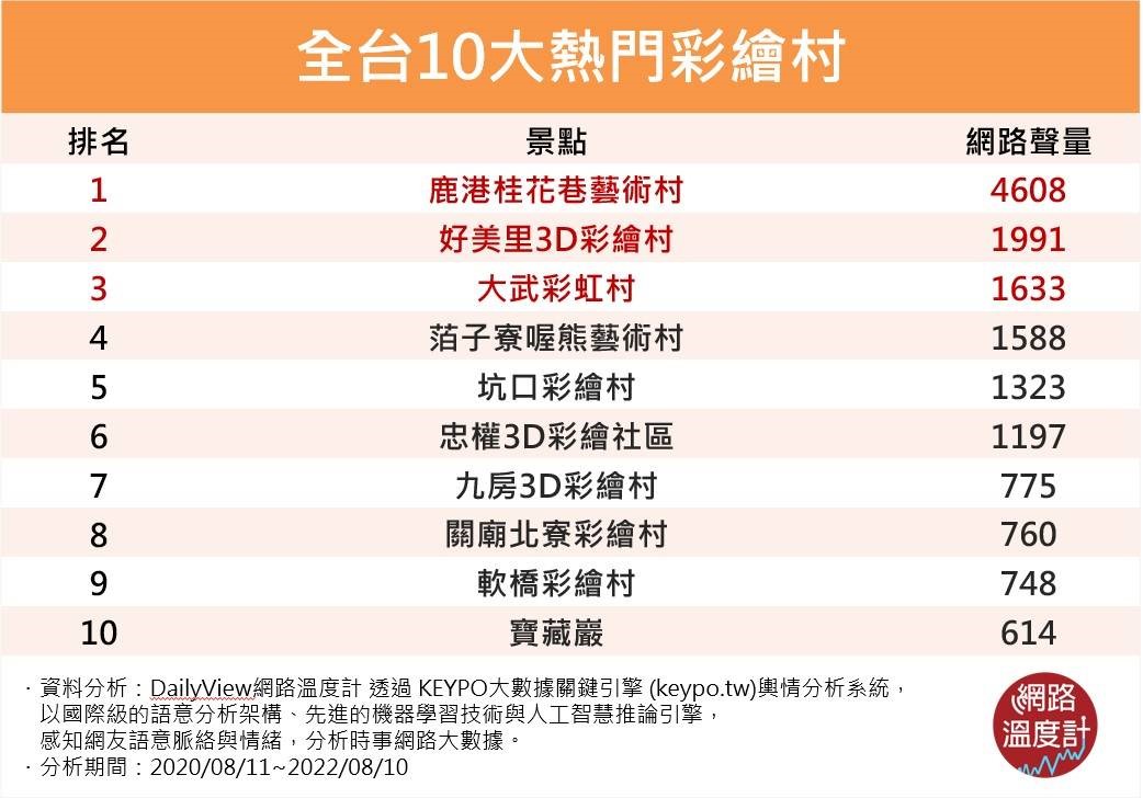 除了彩虹眷村,全台其實還有不少彩繪村值得一探究竟,《DailyView網路溫度計》透過《KEYPO大數據關鍵引擎》輿情分析系統調查近兩年來熱門的彩繪村景點,不過像是彩虹眷村、美仁里彩繪村、大內龍貓公車站等,地標上顯示「暫停營業」之處,則不納入本次評比。一起來看還有哪些好看、好拍的彩繪村,可以收進旅遊口袋名單中!