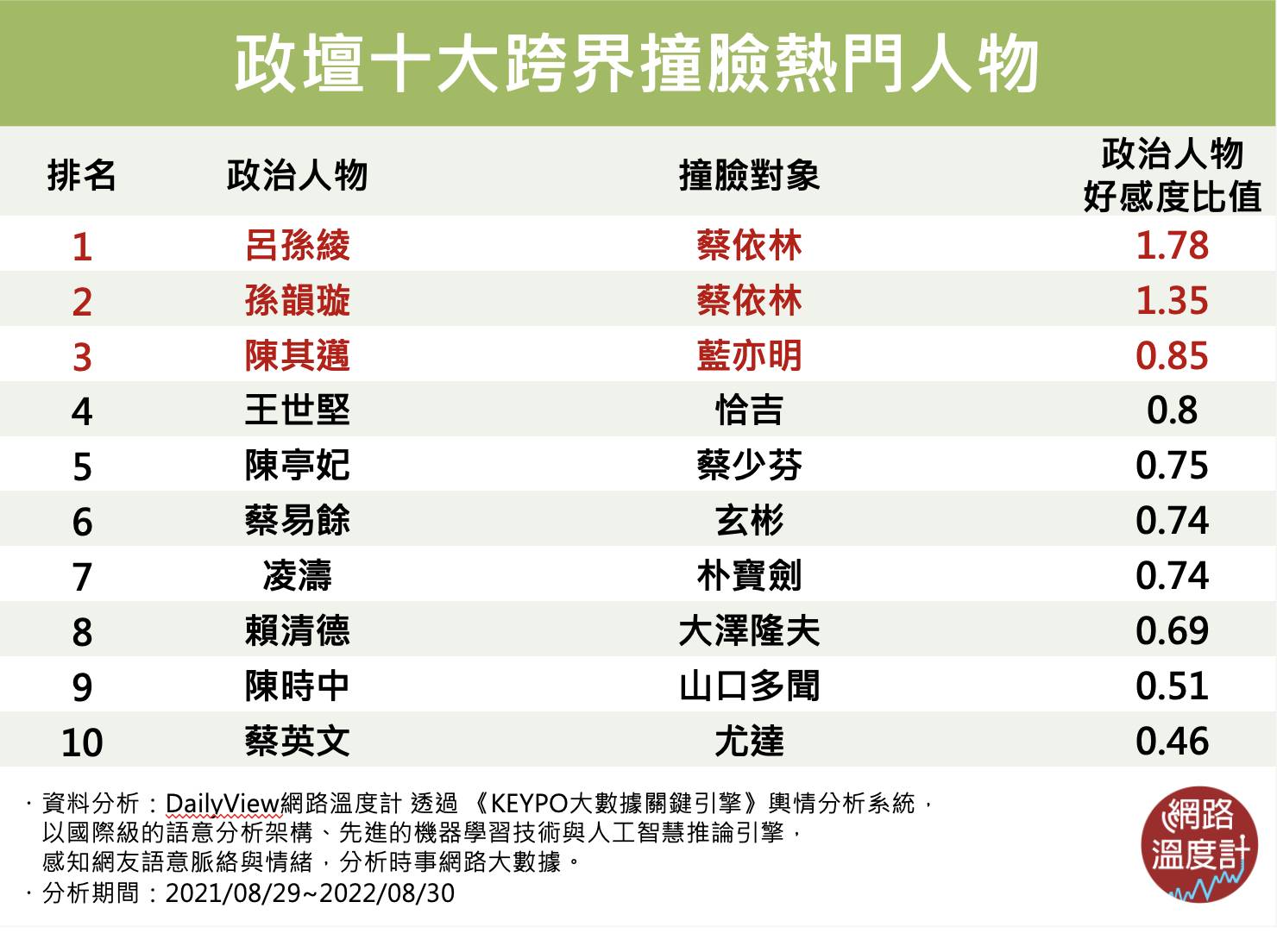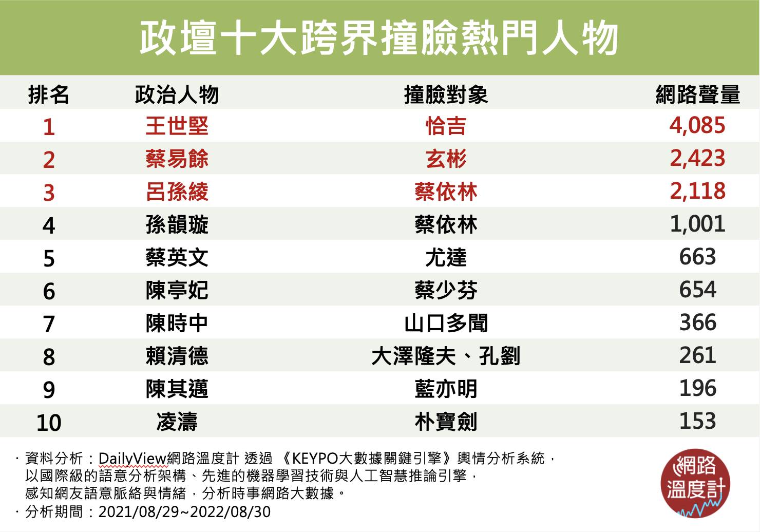 今天《DailyView網路溫度計》透過《KEYPO大數據關鍵引擎》輿情分析系統,統計出最被網友討論政壇跨界撞臉人物。除了王世堅、陳亭妃以外,你知道還有哪些人上榜嗎?