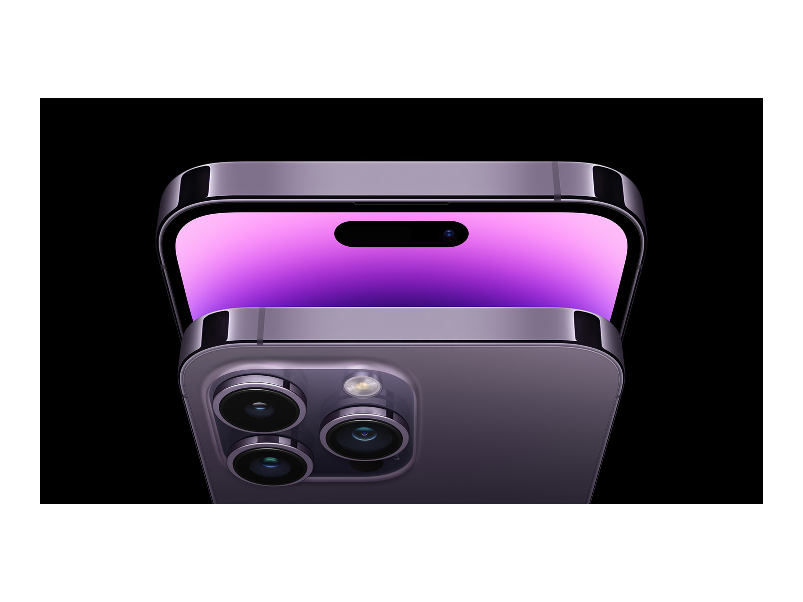 iPhone 14 Pro、iPhone Pro Max則具備隨顯(always-on)螢幕,且進一步整合前端相機的通知功能(見圖),蘋果將之形容為「動態島嶼」(dynamic island)。iPhone 14 Pro定價仍為999美元起、iPhone Pro Max為1,099美元起,9月16日即可開賣。
