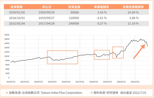 2022年投資難度高,股神失靈、幣神跌落人間,面對市場動盪,正是定期定額投資的黃金時段,好好證券統計顯示,投資人透過定期定額投資,以過去十年的台股三次大拉回,波段的定期定額,投資報酬率遠遠優於單筆申購的投資報酬。