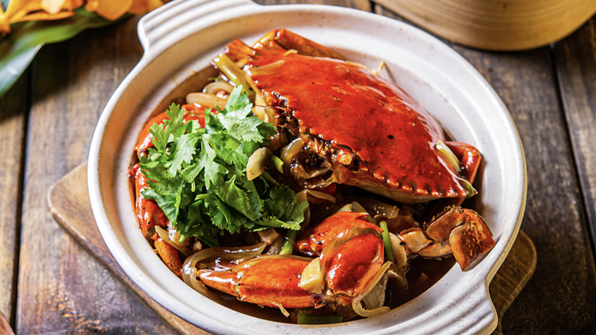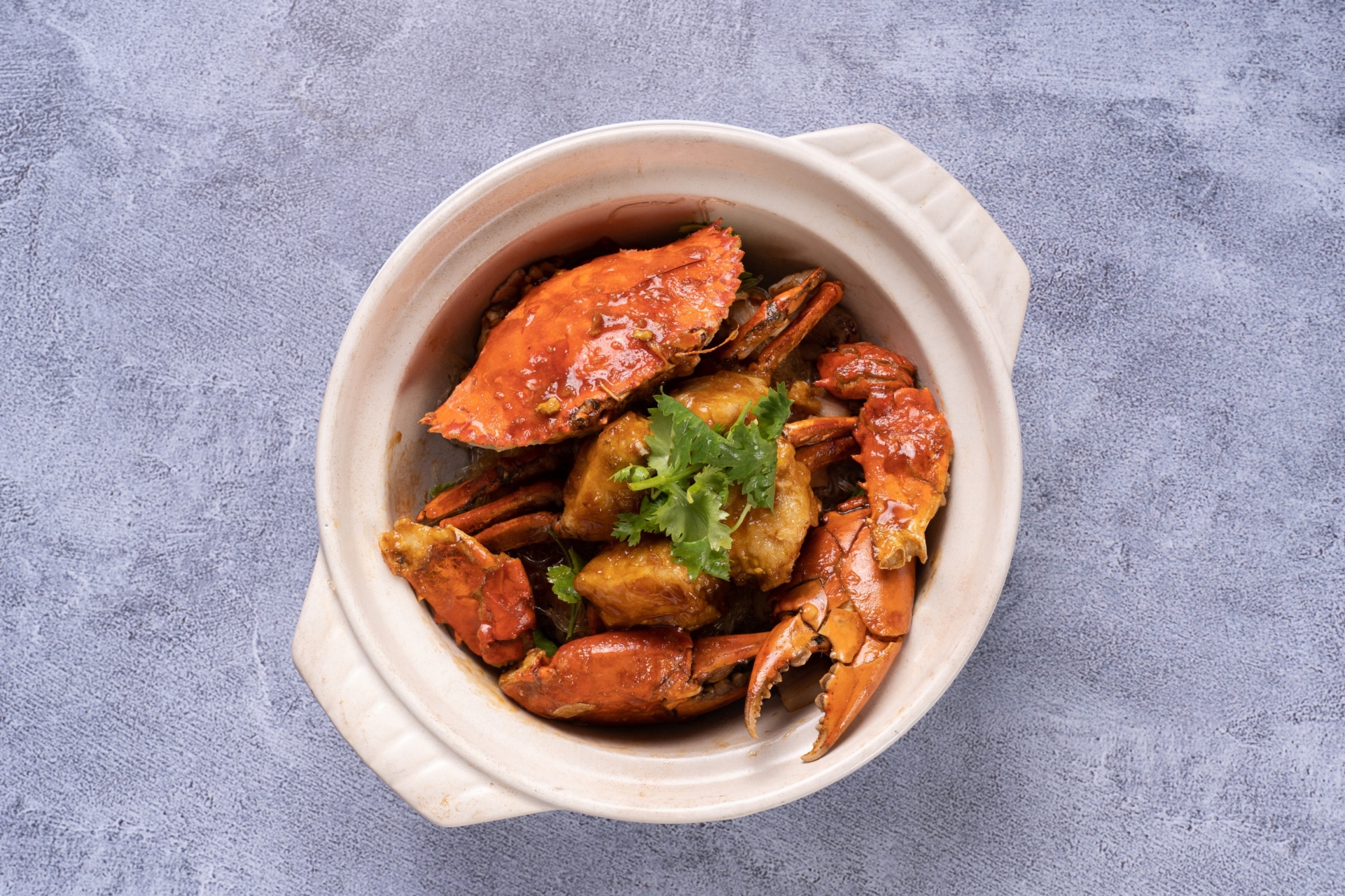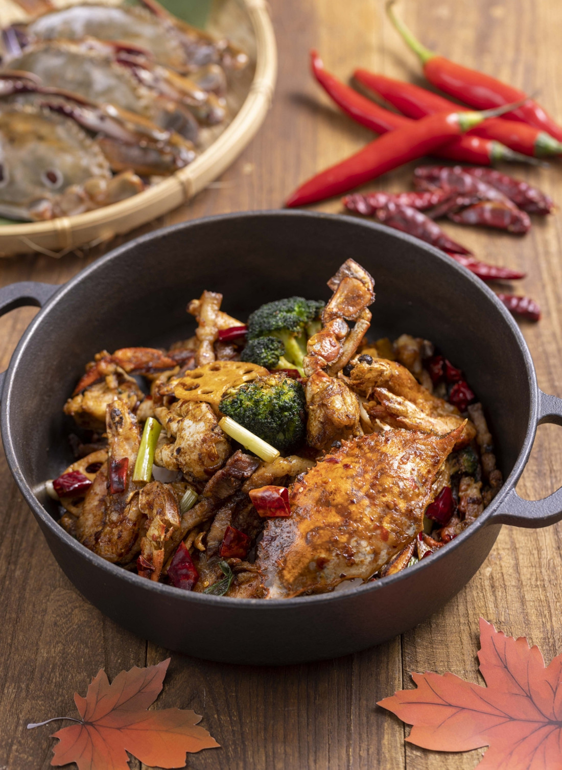 家宴中餐廳於10月份推出「邂逅金秋‧品蟹宴」,每道880元起,其中有最受饕客喜愛的港式經典名菜「避風塘炒蟹」,主廚先以蒜酥、豆豉、乾辣椒以及特製醬料一同爆炒出香氣,搭配巧思撒上壓碎的出前一丁泡麵與麵包粉增加酥脆口感,香辣惹味豐富滋味,讓人直呼好過癮;融入四川在地元素的「蜀香蝦蟹干鍋」,將三點蟹、鮮蝦、蓮藕片、花椰菜、五花肉條以大火過油,再加入辛香調味料大火翻炒立即上桌,外殼香酥肉質肥美的螃蟹沾裹香辣醬汁,嗆辣中透出微甜滋味,豪邁過癮讓人回味無窮。