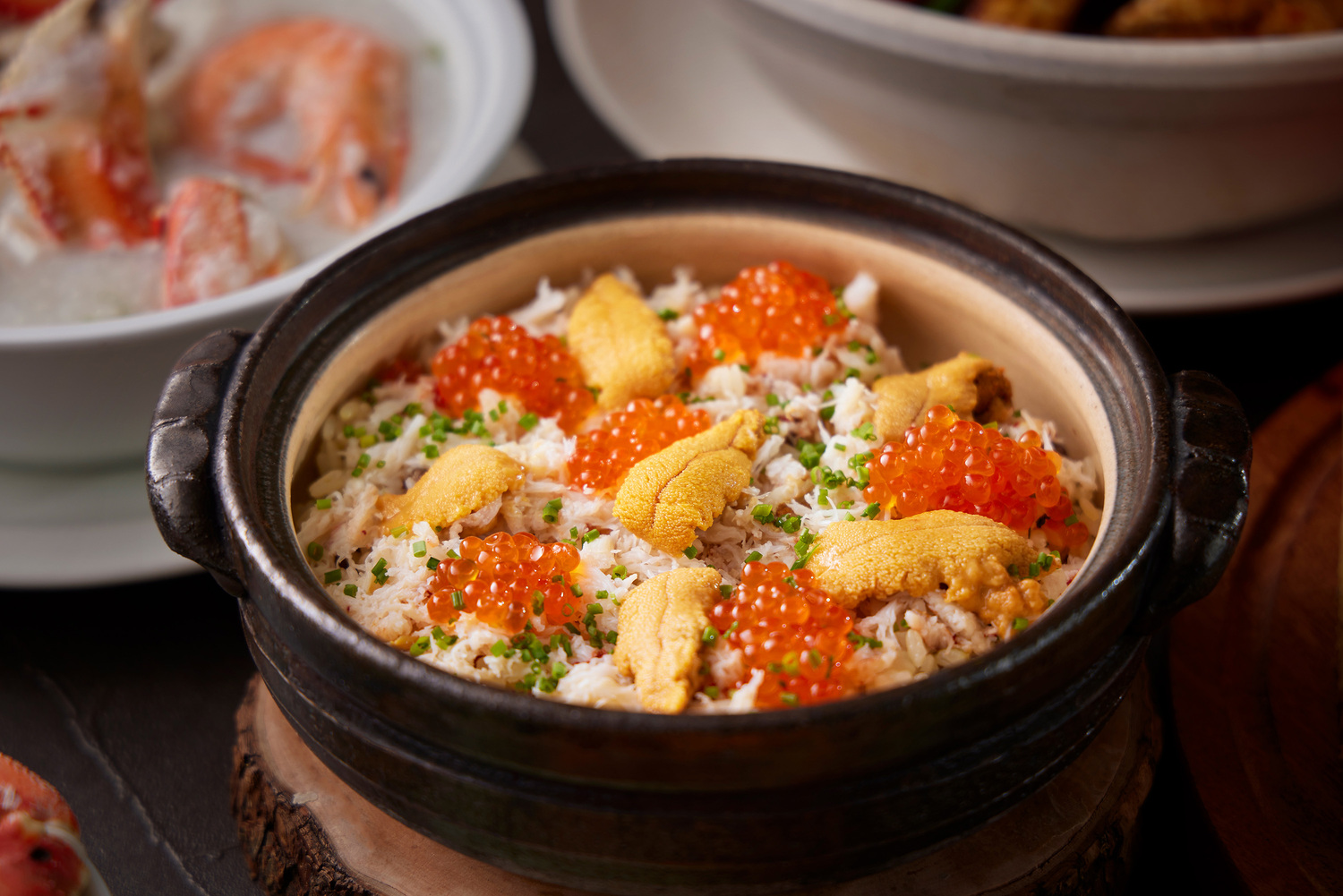 大廳酒吧則推出兩款黃金蟹美饌,僅取用黃金蟹肉展現炒飯鮮美的「黃金蟹肉炒飯」,鑊氣十足、粒粒有味,以及選用全隻黃金蟹與花枝、淡菜、白蝦、鯛魚等海味熬煮成粥濃鮮美的「黃金蟹海鮮粥」,每道580元,入秋之際讓鮮濃蟹味溫暖味蕾,上述價格需另加一成服務費。