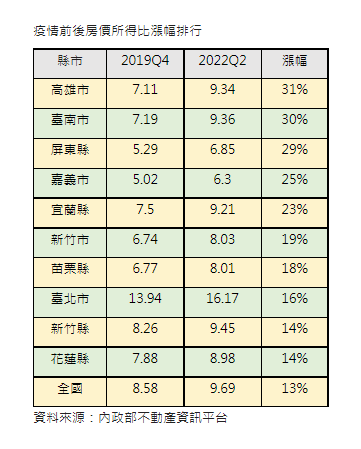 【理財周刊記者顏瓊真報導】疫情期間房價漲勢驚人,根據官方統計今(2022)年第二季的房價所得比資料,全國的房價所得比增加到9.69倍,若和2019年第四季國內疫情發生前相比,房價所得比增加約13%,其中增幅最大的幾乎都出現南台灣,「南高屏」房價所得比較2019第四季增加29%~31%,由於過去房價基期低,因此遇到一些題材發酵後,房價上揚幅度也相對大。