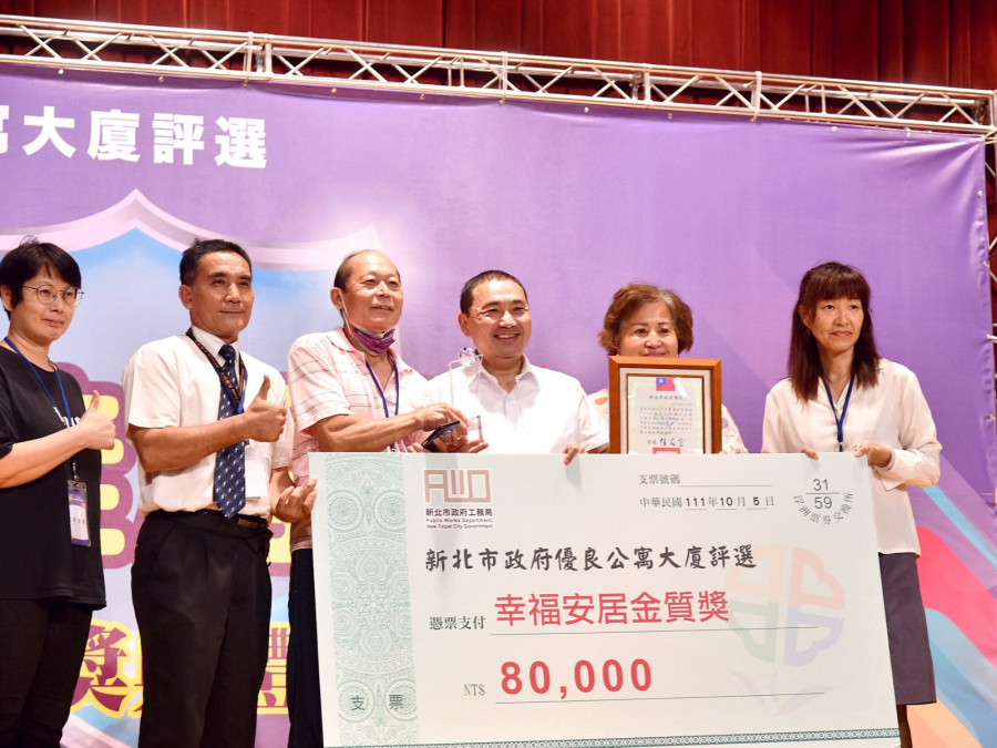 新北市優良公寓大廈評選活動已邁向第16屆,本屆依社區特色分為大型、中型、小型、風華再現及山坡地社區等5個競賽組別,每組再選出幸福安居金質獎、及多項特色獎,其中幸福安居金質獎獎金高達8萬元,今年共有8家社區獲獎;各類特色獎(管理特色獎、綠環境特色獎、營造與關懷特色獎、防災推動獎)獎金3萬元,則有33家社區獲獎。