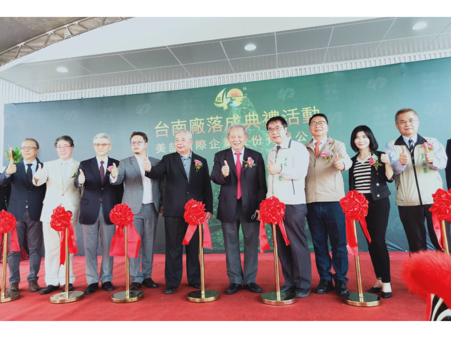 美喆新廠落成開幕典禮,由董事長陳本源(右5)主持,並邀請台南市長黃偉哲(右4)、陳歐珀立委、投資台灣事務所陳明珠營運長、台南市經濟發展局陳凱凌局長、臺南市勞工局王鑫基局長、台南市警察局方仰寧局長、陳怡珍議員等嘉賓一同歡慶,共同見證美喆邁入新的里程碑。
