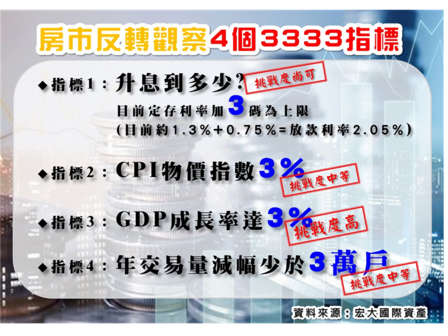 【理財周刊記者顏瓊真報導】美國連續升息7次,讓資金活水急速縮水,而台股大跌,從「萬八」到「萬三」,投資人荷包大失血,沒錢轉進台灣房市下,未來房市會走跌嗎?宏大國際資產總經理陳益盛提出自用投資買房的4個3333觀察指標,並指今年移轉件數減少低於3萬戶,顯示民眾對於房市的信心還不至於太差,若大於3萬許多,則顯示購屋信心悲觀。
