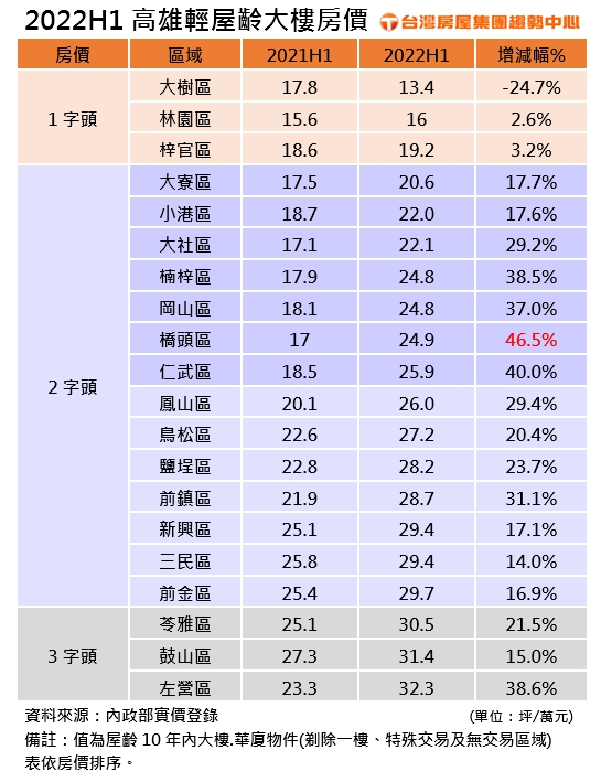 觀察今年上半年,高雄共有7個行政區,輕屋齡住宅房價表現突飛猛進,短短一年間就從1字頭房價攜手登上2字頭列車,且這些區域多為市郊蛋白區,其中像是岡山、楠梓區增幅逼近4成,仁武及橋頭則漲破4成,橋頭區更以46.5%增幅,榮登最佳進步獎。