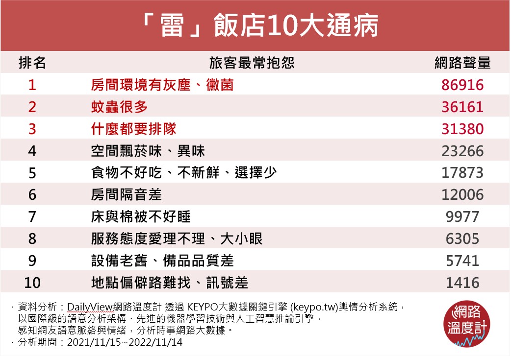 許多人喜歡趁著連假安排小旅行、入住高級酒店、飯店來犒賞自己,但若是遇到飯店頻出狀況、服務不佳,且住飯店花費普遍不低,出遊的好心情瞬間全毀,甚至有人會感到被「當盤子」。《DailyView網路溫度計》透過《KEYPO大數據關鍵引擎》輿情分析系統調查近一年網友最常抱怨「雷」飯店或酒店(排除民宿、汽車旅館)會有的10大通病,預訂前可注意有無以下評價,幫大家守住荷包避免踩雷!