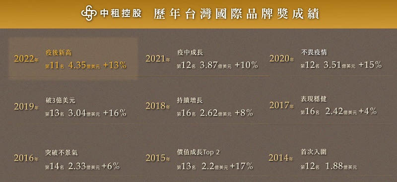 【理財周刊記者顏瓊真報導】中租控股(中租-KY,5871)再傳喜訊,2022年台灣25大國際品牌於今(22)日揭曉,中租控股第9度榮獲入榜,成績再晉級攀升,位列第11名,品牌價值達4.35億美元,較去年品牌價值增加13%。自2014年首次入圍起,品牌價值連年增長,迄今已超過1倍,展現高度成長動能。