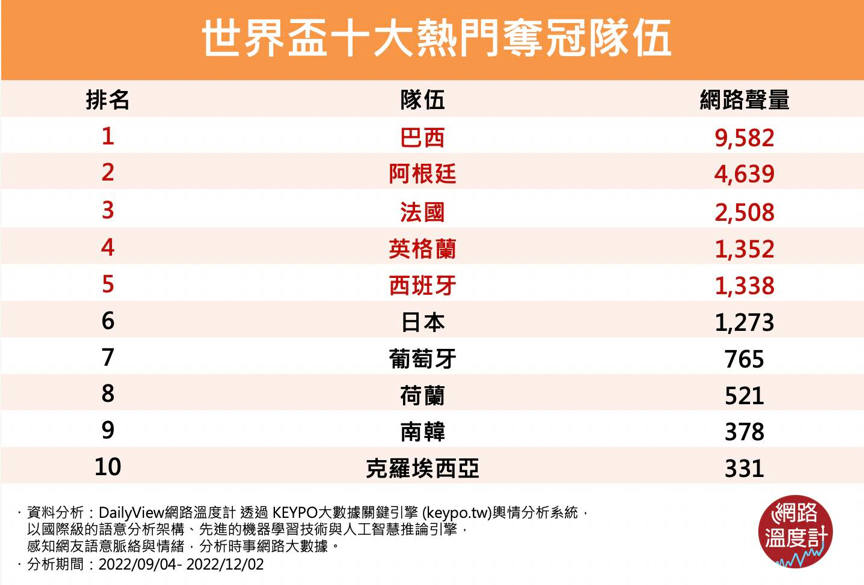 這次《DailyView網路溫度計》透過《KEYPO大數據關鍵引擎》輿情分析系統,調查出「世界盃十大冠軍熱門隊伍」,快一起來看看哪些隊伍聲量最高吧!