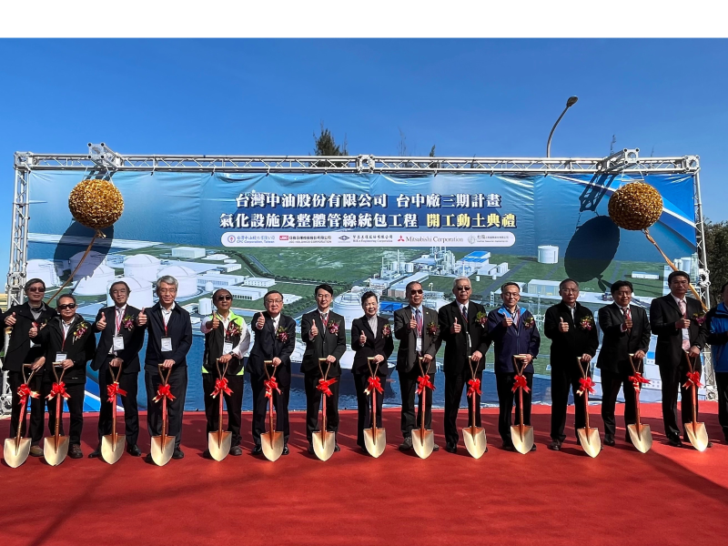 開工動土典禮由台灣中油董事長李順欽(右6)主持,包括經濟部長王美花、聯合承攬統包廠商JGC Holdings Corporation Sato Masayuki CEO、榮工工程股份有限公司總經理薛憲征、三菱商事株式會社董事長Ishikawa Go、杜風工程服務股份有限公司董事長曾一平、勞動部職安署主任李文進及台中港務分公司總工程師羅勝方等貴賓參與。
