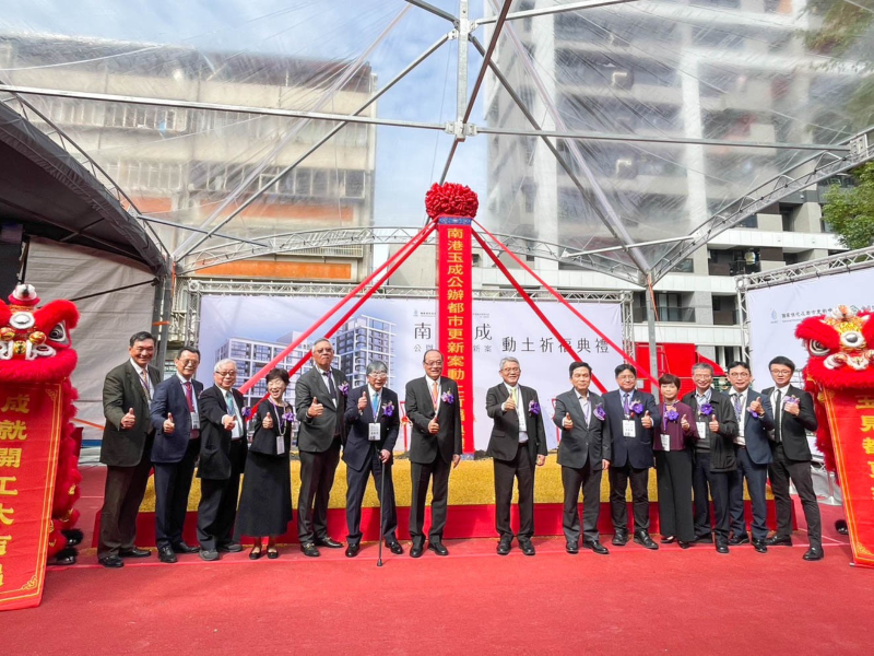 12日進行的「南港玉成公辦都更案」動土祈福典禮,由內政部代理部長,同時也是國家住都中心代理董事長花敬群親自執鏟,邀請出資人中國開發資產管理公司董事長鄭重、營建署署長吳欣修蒞臨,而日本建築師伊東豊雄(左6)特別來台參與。