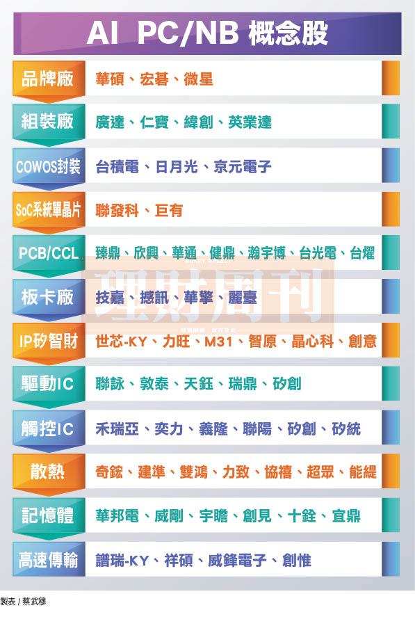 另外,運算不能空轉,生成式AI需要處理龐大的資料量,高速傳輸也不可少,高速傳輸晶片由Thunderbolt 3升級至Thunderbolt 4/5、USB3.0提升至USB 4.0、傳輸介面由PCIe 3.0升級至 PCIe 4.0/5.0,目前已經有傳聞將支援PCIe 6.0,相關廠商如譜瑞-KY(4966)、祥碩(5269)、群聯(8299)、威鋒電子(6756)等將飽吃這一波商機。