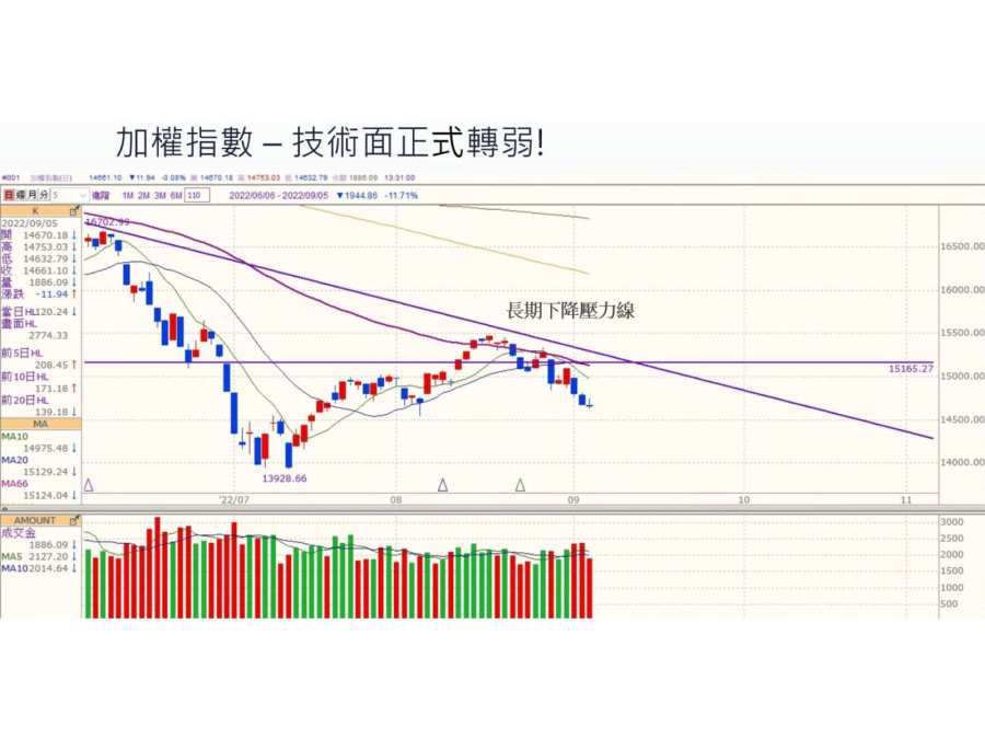 台股持續弱勢,聯準會偏鷹派,在通膨問題持續下,預估九月聯準會仍將升息三碼,且在後續一段時間將維持相對高的利率水準,對股市有負面效果。近期亞洲貨幣劇烈貶值,包含人民幣及新台幣等,也易使外資有比較強烈的匯出慾望,因此,在經濟向下及資金面流出前提下,預估中秋過後國際股市及台股仍會是壓力相對沉重,操作上宜採取保守策略!