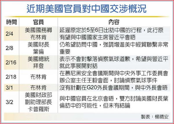 中美之間的多重矛盾,近期在國際舞台頻頻顯現,美國國務卿布林肯(Antony Blinken)1日表示,在出席二十國集團(G20)外長會議期間,沒有與中國外交部長秦剛會面的計畫。曾表態希望訪中的美國財長葉倫,行程也仍喬不定,顯示原計劃再度舉行的「習拜會」仍遙遙無期。