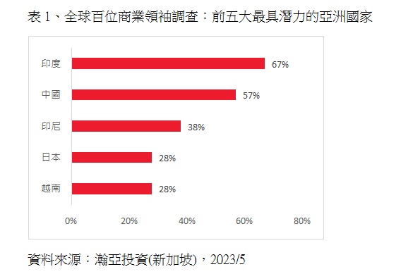 1.企業在亞洲尋求擴張及發展,看好國家為:印度(67%)潛力最大,緊隨其後是中國(57%)及印尼(38%)(見表1)。