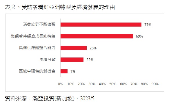 2.看好亞洲擴張或轉型機會的原因,77%受訪者看好亞洲消費群不斷擴大;69%對於亞洲未來經濟增長樂觀(見表2)。