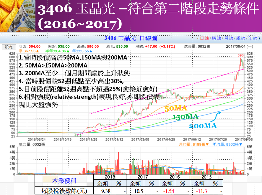 股價高於200MA(日)。200MA本身處於上升趨勢。150MA高於200MA。股價處於明顯上升趨勢,波段高點與回檔低點持續墊高,而呈現出階梯狀型態。50MA位在150MA之上。日線與週線價漲量增,價跌量縮。日線或週線高於平均量的線形中,上漲K線的數量多於下跌K線。股價從底部或許已經翻了一、兩倍。但這可能只是開始而已,股價可能繼續大幅上漲。若公司持續成長狀況可吸引機構法人,則買盤也就會源源不絕,尤其若能連續幾季公布優異盈餘的話。
