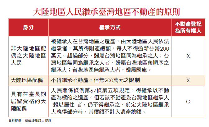 如果身份是「非大陸地區配偶之大陸地區人民」,以及「大陸地區配偶」,原則上並無法繼承不動產,但如果是「具有在臺長期居留資格的大陸配偶」,則依據《兩岸人民關係條例》第67條第五項規定,得繼承以不動產為標的之遺產。但若該不動產為台灣地區繼承人「賴以居住」者,仍不得繼承之,於定大陸地區繼承人應得部分時,其價額不計入遺產總額(如附表)。