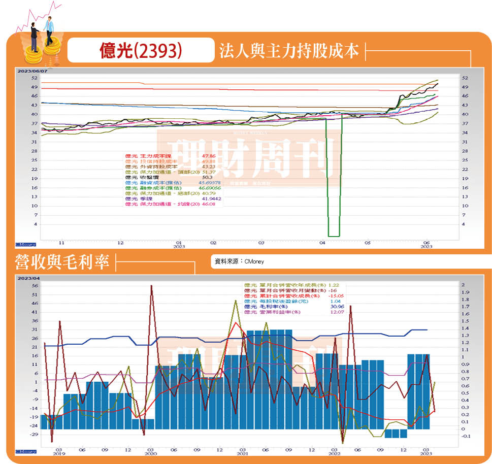 理周投研部表示,億光除基本面轉佳外,個股股價技術線型的結構也相當不錯,5月11日從41元起漲後,雖期間仍有震盪,但都在五日均線上,短線若維持不變,攻上站穩50元,那麼以本益比14倍計,目標價可以上看58元。