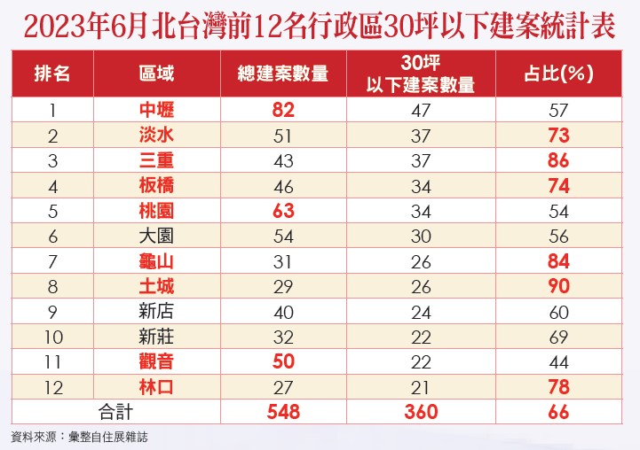 ▲圖5:2023年6月北台灣前12大行政區30坪以下建案數量對照圖 資料來源:彙整自住展雜誌