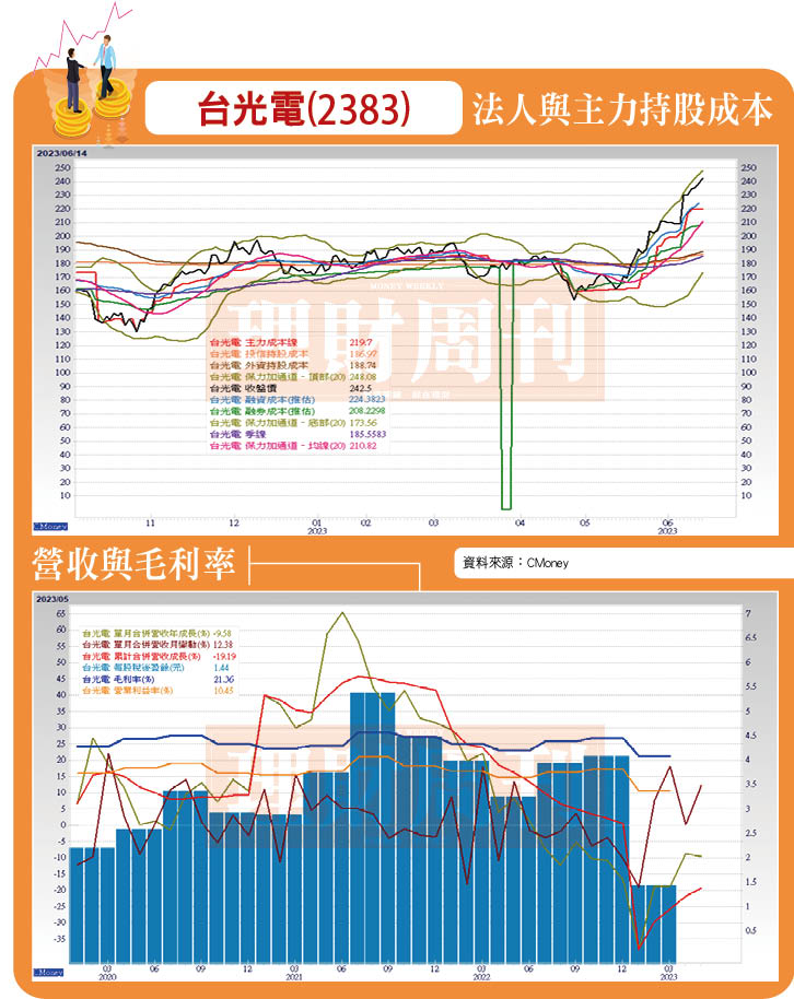 台光電6/13截稿前收盤價239元,2022年EPS 15.24元、本益比15倍,預估今年發放現金股利8.5元,殖利率3.5%。美系外資預估今年EPS可達19.38元,調升目標價到234元。技術線圖日線來看,5/15收盤價174元突破前高之後,股價一路上揚,周線亦呈「一星二陽」的多頭格局,可多留意。