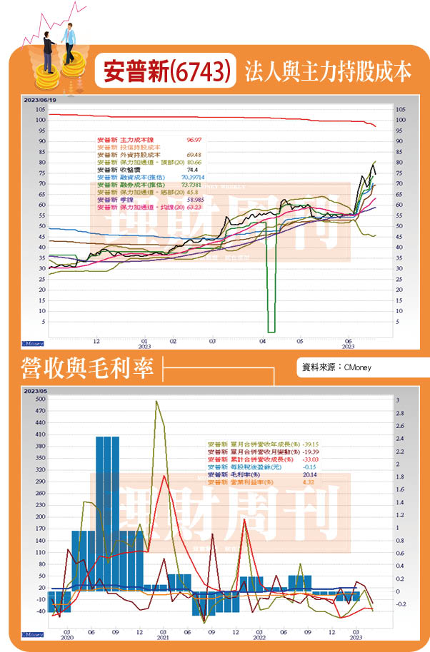 不過值得注意的是,自今年三月以來,安普新原先供貨的客戶,下單情況已經有開始回溫態勢,三、四月單月營收,已連續二個月交出20%以上月增率佳績,同時,營收年變動率也在四月份正式轉正,營運已經走出谷底、重見成長曙光。