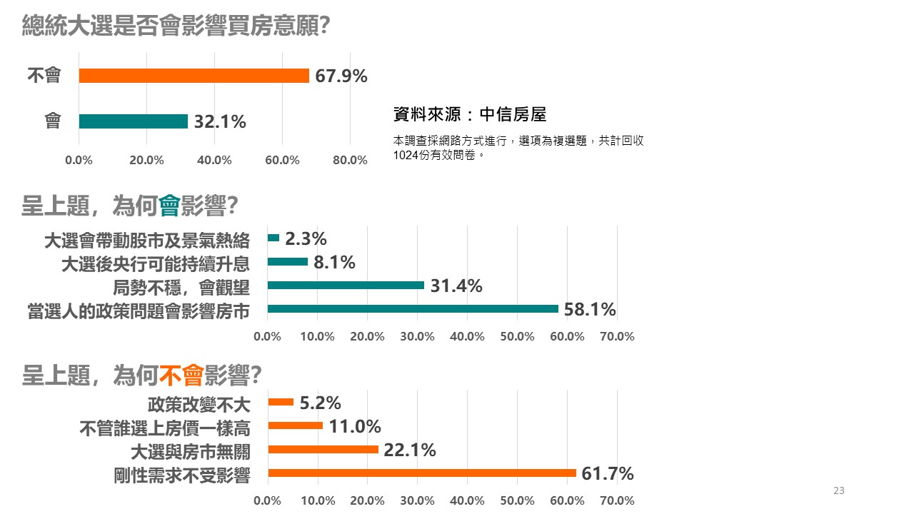 時事調查部分,2024總統大選三黨參選人幾乎已底定,雖副手暫無著落,各陣營之間近日已展開激烈攻防,針對總統大選對於房市的影響,民眾的看法如何呢?根據調查顯示,有67.9%的受訪者認為總統大選不會影響買房意願,主要原因多為有買房的剛性需求;而認為會影響買房意願的有32.1%,主要原因是認為當選人的政策會影響房市。