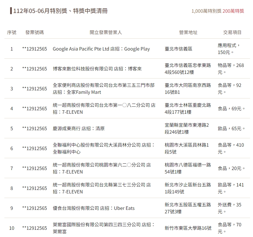 112年3-4月期統一發票中獎號碼,千萬特別獎獎號為「20783987」、獎金200萬元的特獎號碼為「04135859」、頭獎(20萬元)三組分別為「94899145」、「71143793」、「41055355」,目前仍有4張千萬特別獎還沒人領,包含在南投縣信義鄉明德村玉山路統一超商消費62元;高雄市岡山區岡燕路山隆加油站消費100元;Google Play上消費670元購買應用程式;屏東縣高樹鄉高樹村南興路全家超商消費2,000元購買遊戲點數。
