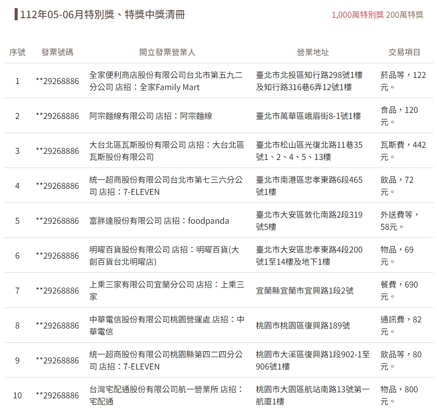 此外,財政部也表示,112年5-6月期統一發票中獎號碼已於7月25日開出,特別獎獎金新臺幣(下同)1,000萬元中獎號碼為29268886,特獎獎金200萬元中獎號碼為12912565,排除空白、作廢、金額不符或買受人記載為營業人等不符給獎規定之發票,可兌領特別獎及特獎之中獎發票分別為21張及16張。