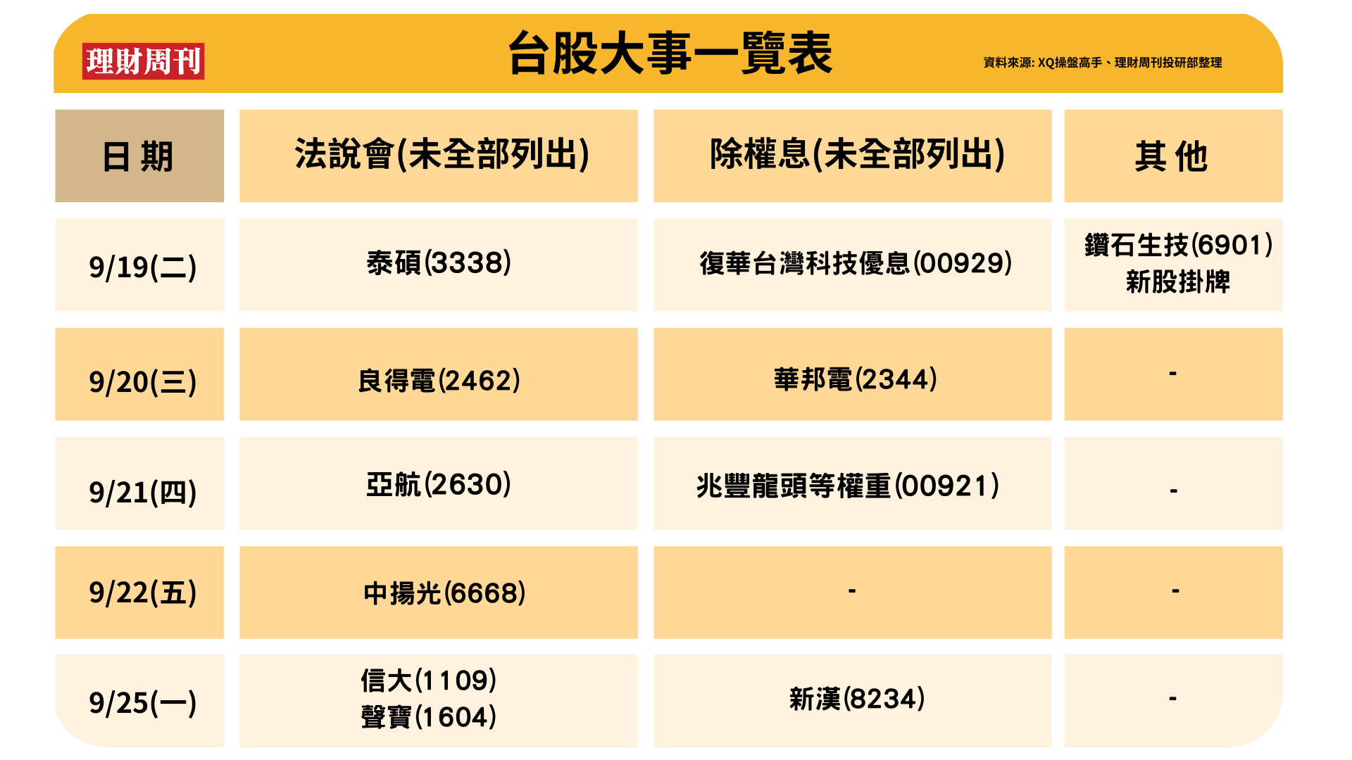 台灣股價加權指數於9/19(二)收16,636.32點,下跌61.92點(–0.37%),9/15(上週五)一度站上季線,但9/18(一)隨即回落,目前仍在均線糾結格局。
