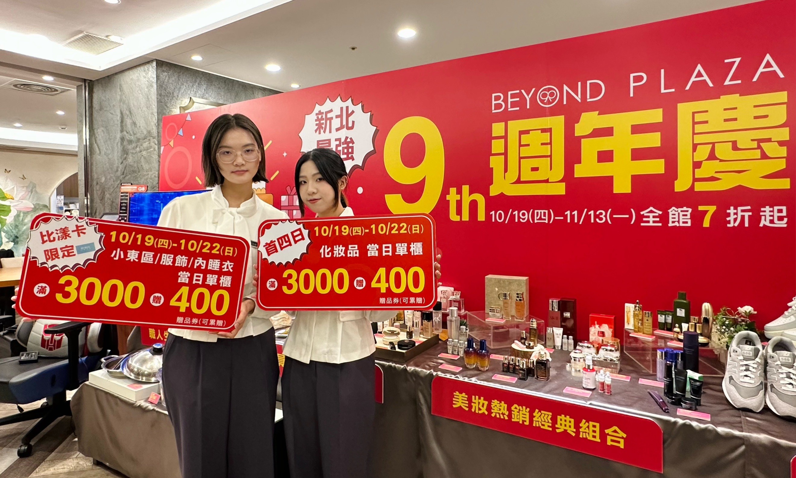 九週年慶檔期,首四日化妝品單櫃滿3,000贈400,同期,持比漾卡於小東區/男女童裝/內睡衣單櫃滿3,000贈400,回饋皆達13.3%。另外,為回饋比漾聯名卡卡友,獨家挑選約100項DM商品,其中包含化妝品、潮流運動單品、廚具、床寢及家用家電等產品,只要使用台新銀行比漾聯名卡購買指定商品,就可享額外獨家回饋。其中化妝品加碼品項高達53組,單一商品最高額外加碼200元;加碼品牌包含Dior、ESTEE LAUDER、LANCOME、sisley、L’OCCITANE等知名品牌,就是要讓比漾聯名卡卡友享受優於市場的超值購物回饋!