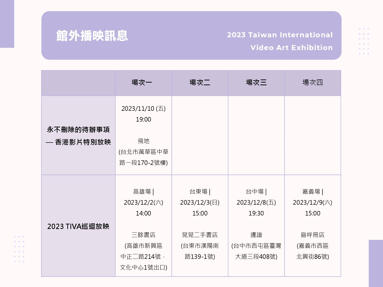 除了巡迴放映外,本次也特別與台北的飛地書店合作舉辦「永不刪除的待辦事項—香港影片特別放映」,放映本屆徵件作品中關照著香港社會處境的錄像作品,希冀透過巡迴播映以及線上展場等多元形式,觸及並照料位於遠方的觀眾朋友,也關照與服務台灣的多元社群。