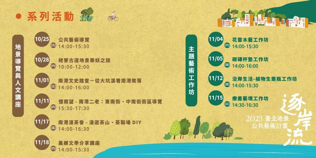 「逐岸流」以藝術策展的方式引導民眾循著地景發展的軌跡,重新認識南港區的城市面貌。此次活動除了3組地景藝術作品展出外,同時也邀請了15間在地商家,分別與15位新星插畫家共同打造「畫中的街景」插畫創作活動,插畫作品將在商家展出一個月,10場地景走讀、黑鄉文學人文講座和療癒手作的創意工作坊等活動陸續開放報名,誠摯邀請市民朋友走進南港,尋回消失的地景,品味現下的生活。
