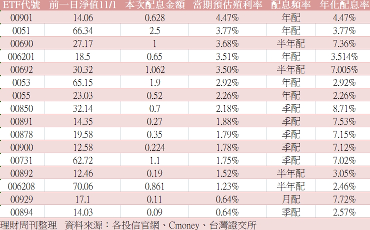 從這11月除息的16檔ETF的當期預估殖利率來看,第一名為00901的4.47%,第二名為0051的3.77%,第三名為00690的3.68%,第四名為006201的3.51%。