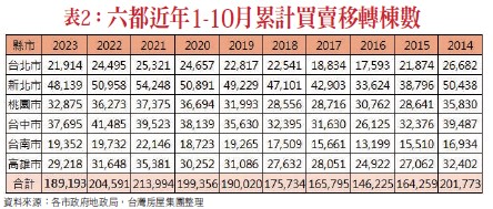 另進一步觀察今年一至十月六大都會區建物買賣移轉棟數,六都整體交易量合計為189,193棟,較去年同期減少7.5%,仍是自108年來最低交易紀錄,創五年新低,不過,減幅已縮小至個位數。