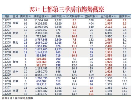 至於各地區市場表現,在「國泰台北市房地產指數」方面,第三季房價漲多回檔,回到一年前起漲點,由於新建案每坪均價仍在百萬以上,以精品小宅總價控制個案銷售率較佳。整體而言,相較上一季價量俱跌,房市表現衰退;相較去年同季價穩量縮,房市表現偏弱。